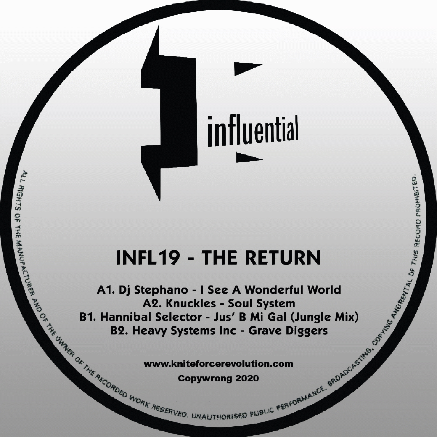 Influential was a Kniteforce owned jungle / d’n’b label that ran for nearly 20 releases back in the late 90’s, before coming to a halt as KFA took off. But now it is returning, revamped into an old skool styled jungle label, complete with irreverent samples and deep jungle bass and dancehall vibes. All four tracks on this EP lean in slightly different directions, but all are forwards in reverse, proper jungle for those who know the original sound…
