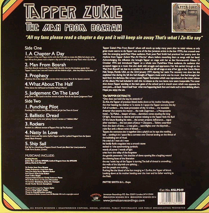 Tapper Zukie’s ‘Man From Bosrah’ album still stands up today many years after its initial release, as only great music seems to do. Tapper was one of the few Jamaican artists in the late 1970’s, that crossed over with the emerging punk/New Wave audience. Punk poet Patti Smith had practiced her poetry over the rhythms from Tapper Zukie’s ‘Man Ah Warrior’ album, before reworking them as songs with her band. Acknowledging this influence she brought Tapper on stage with her at the Hammersmith Odeon 23 October 1976 and introduced Tapper to a whole new Punk/New Wave audience. An audience that accepted reggae as a music that also dealt with struggle and oppression. Her link carried through to this ‘Man from Bosrah’ set due to an accident in which she fell off stage at one of her gigs at the Curtis Hixon Hall, Tampa, Florida USA, on the 23rd January 1977, injuring her neck. The recovery was slow but she explained that during the fall she had thought of Tappers music and it was his music that had brought her back from the darkness. She wrote a poem Tapper Extraction which was reproduced on the initial release of this album. We had included it with this re-release as the two items now seem inseparable. The cover shot shows Tapper standing at the back gates of the school yard in trench town which was opposite his own yard...... sit back listen/read/ hear what was happening back then and made such a time defining album. Hope you enjoy the set.